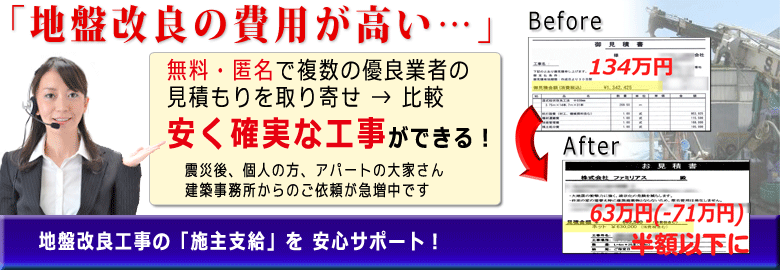 ※なお、当地盤改良見積もりセンターからご提示した見積金額を別業者との価格交渉に利用することは決して行わないで下さい。加盟の地盤改良業者は、人件費をかけ設計・見積もりしますので迷惑行為となります。